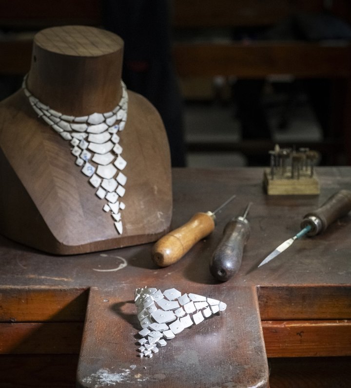 - The Plastron necklace from the Python collection, a unique piece crafted from cast metal in Akillis’ workshop in Barcelona. Made from 18-carat yellow gold and set with GVS diamonds, it took no less than 105 hours of work to design, cast and set.