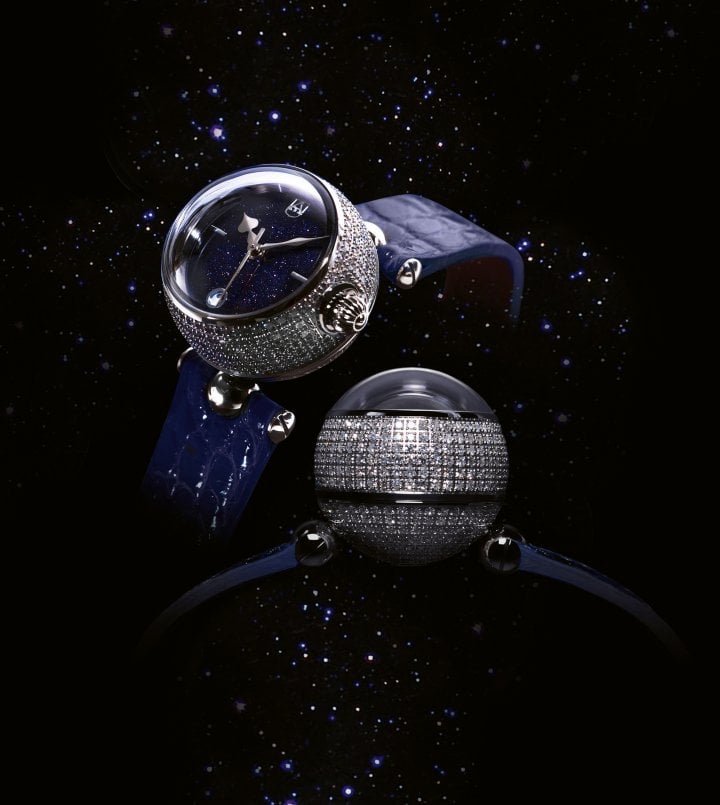 he spherical shape approaches perfection – without edges or corners, but also without beginning or end. The dial made of genuine black river stone shines with the diamond-studded case. The Shar gives a lasting impression – in tune with Alexander Shorokhoff’s motto, “Art on the Wrist”, and avant-garde design language.