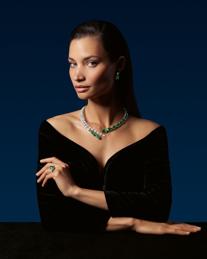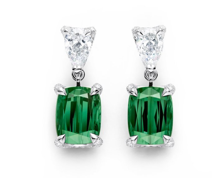 et in 18k white gold and complemented by sparkling diamonds, the greenish-blue tourmalines exhibit an incomparable luminosity in cushion and pear cuts. Tourmaline derives its name from the Sinhalese tura mali, meaning “stone with mixed colours”. Indeed, each crystal reveals its own play of colours which changes depending on the angle of light and creates surprising effects.